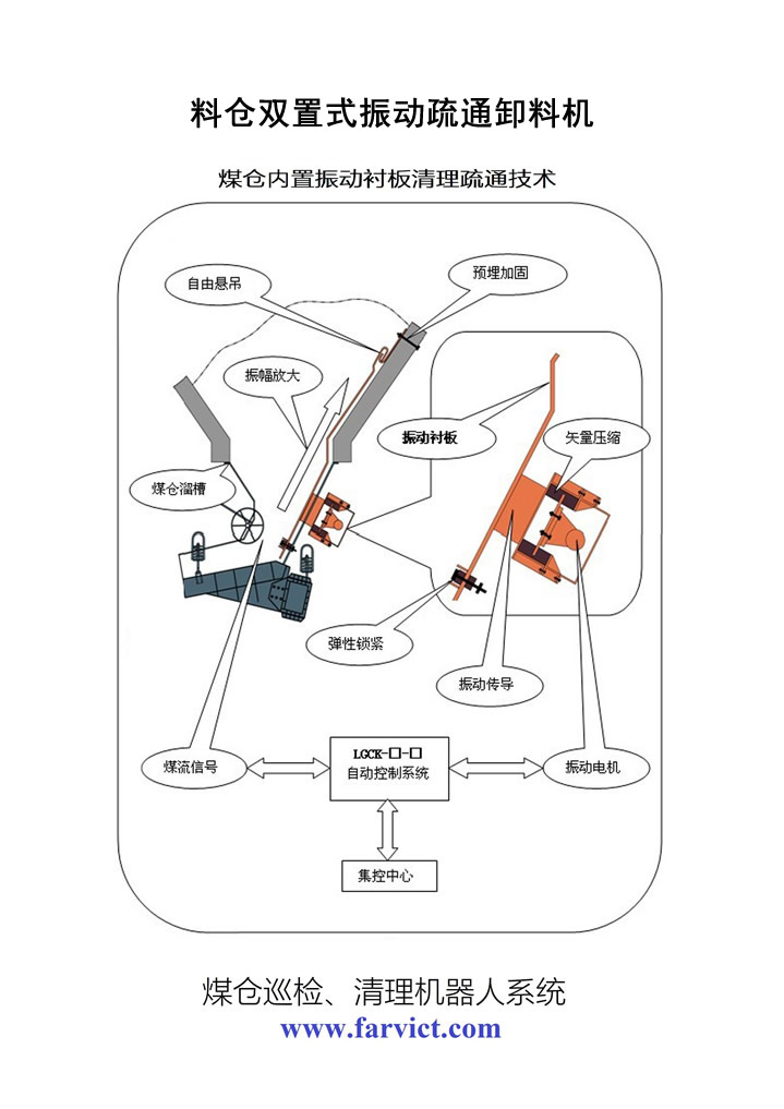煤倉自動化破拱排料系統(tǒng)是針對選煤廠出現(xiàn)的上述問題,引進專利喬斯特〔JOST Company〕公司,先進的亞共振、振動破拱技術(shù),采用國際前沿的雙相彈性矢量壓縮,動量緩沖低頻振動,區(qū)段振幅異步倍增,設(shè)備機體內(nèi)外分置等技術(shù),配合LGCK-□-□系列煤流射頻傳感自動監(jiān)測系統(tǒng),精確控制設(shè)備的有效運行,可實現(xiàn)遠程,就地,人工三位一體集中控制,徹底解決煤礦井下中轉(zhuǎn)煤倉,選煤廠儲煤倉、緩沖倉、受煤坑、閘門溜槽、導料槽、分流槽等關(guān)鍵部位,因煤位靜置而產(chǎn)生的結(jié)拱堵塞問題,適合各類水份大,黏度高,易結(jié)拱的煤種。